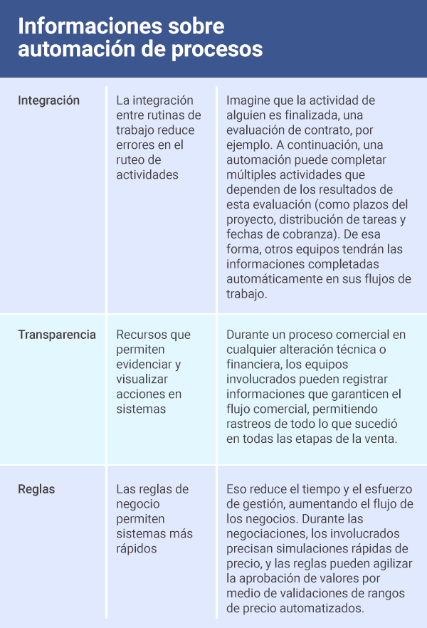 La automación de procesos refuerza las buenas prácticas. Un buen ejemplo es mejorar las informaciones cuando la toma de decisión está sucediendo, además de configurar recursos que muestren informaciones adicionales u opciones disponibles detallando los posibles resultados. Eso puede ayudar a los funcionarios a ejecutar actividades con más seguridad y menos errores.