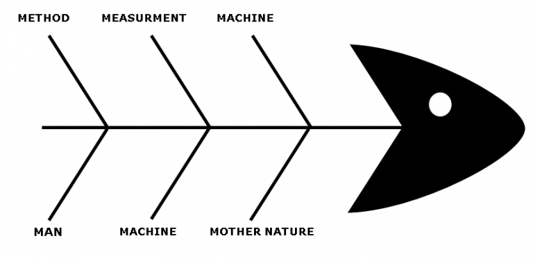 La herramienta ayuda a orientar donde deben estar las causas del problema, agrupándolas en seis categorías, las 6M: Método, Materia Prima, Mano de obra, Máquinas, Medición y Medioambiente.