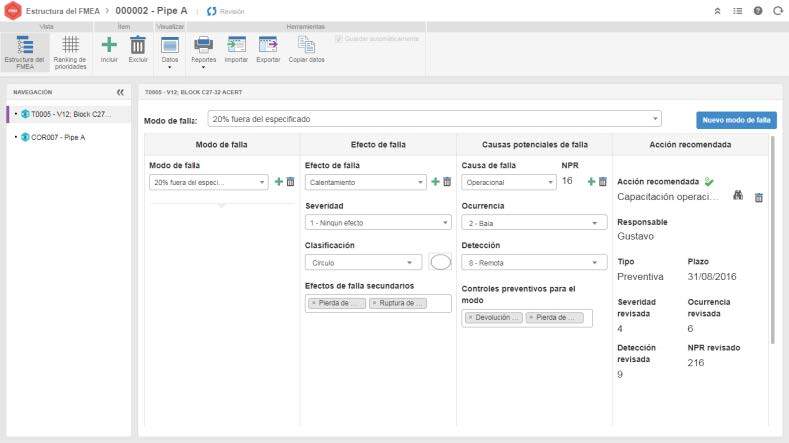 - Exhibe la jerarquía de toda la estructura del FMEA desde el primer nivel (producto o proceso y sus funciones) hasta los niveles más bajos (acciones recomendadas) y genera automáticamente el formulario FMEA.