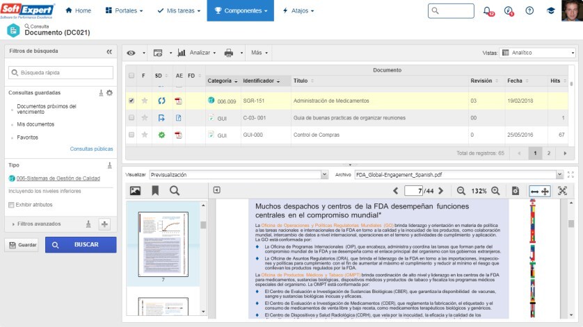 - Aumenta la conformidad regulatoria, a través de la elaboración y aprobación de documentos electrónicos, gestión de copias impresas y auditoría de sistema.